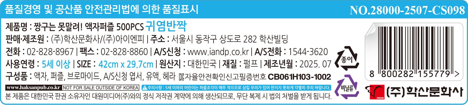 액자 + 퍼즐 + 브로마이드 + A/S신청 엽서 + 유액 + 헤라