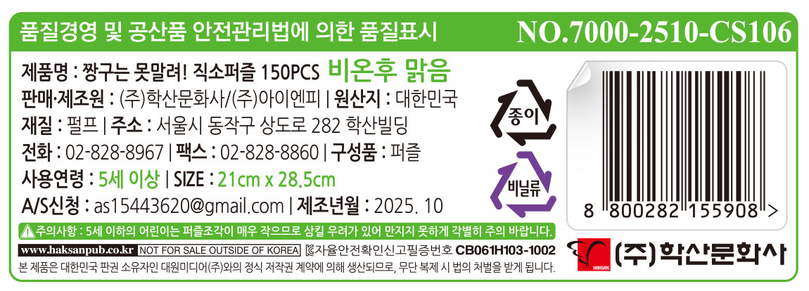 • 교환&반품 주소지: 부산광역시 금정구 금사동 81-1 1층(파손/반송시7N20-1f)