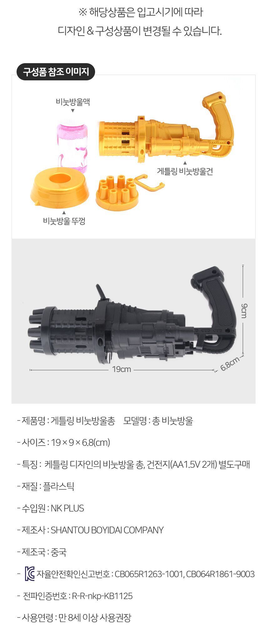 | 품명 및 모델명 | 게틀링 비눗방울 기관총버블건(랜덤) | ||