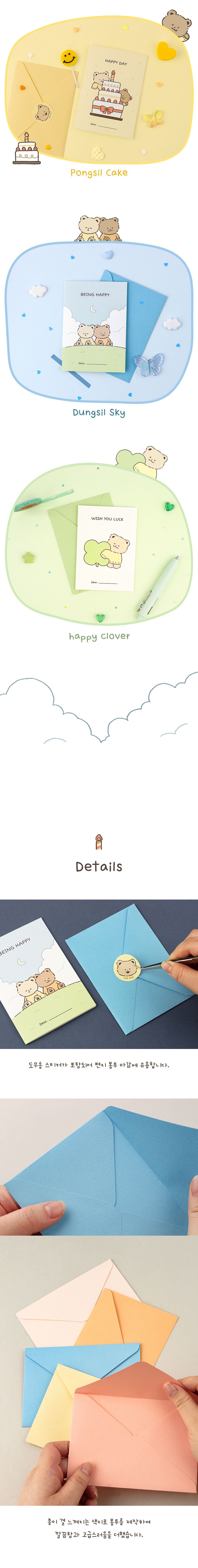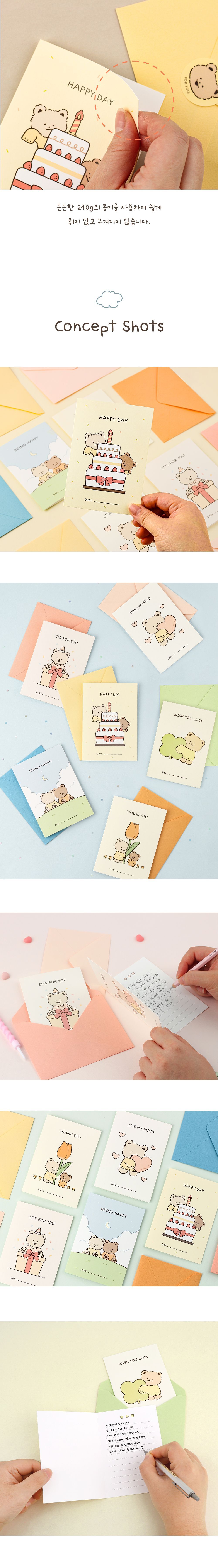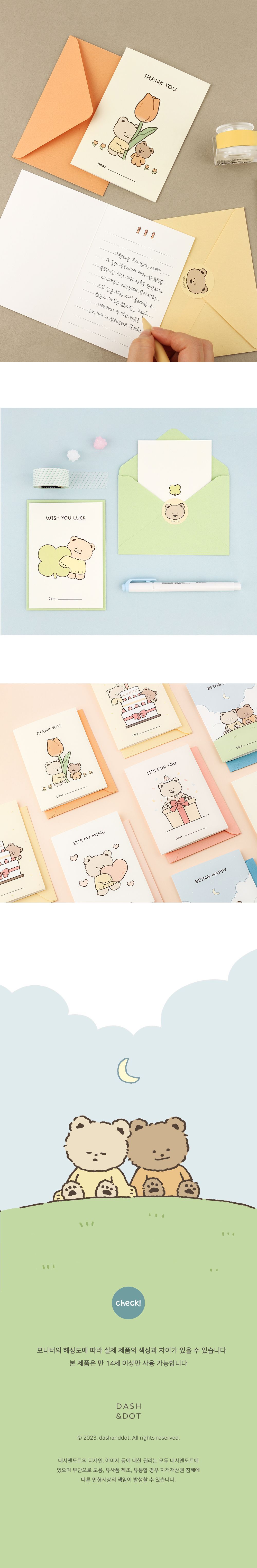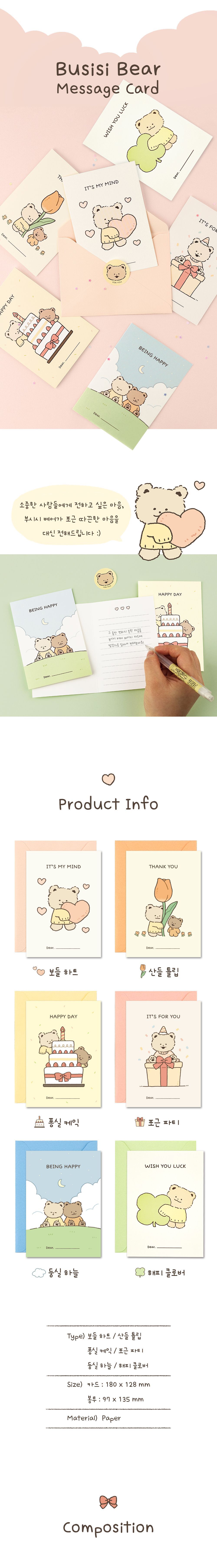 | 제품구성품 | 부시시 베어 메시지 카드 1종 + 편지 봉투 1종 + 도무송 스티커 1종 | ||