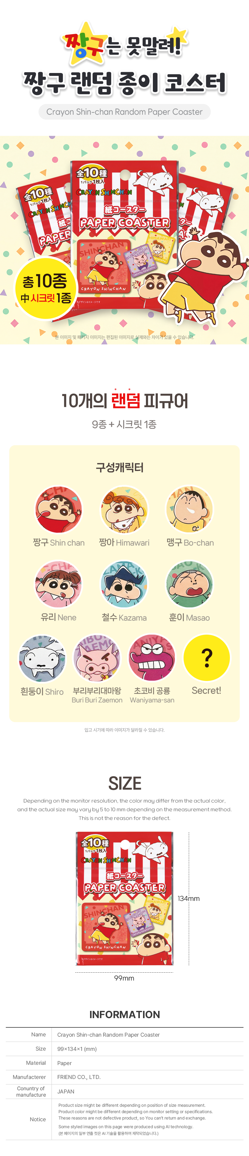| 품명 및 모델명 | 짱구 랜덤 종이 코스터 | ||