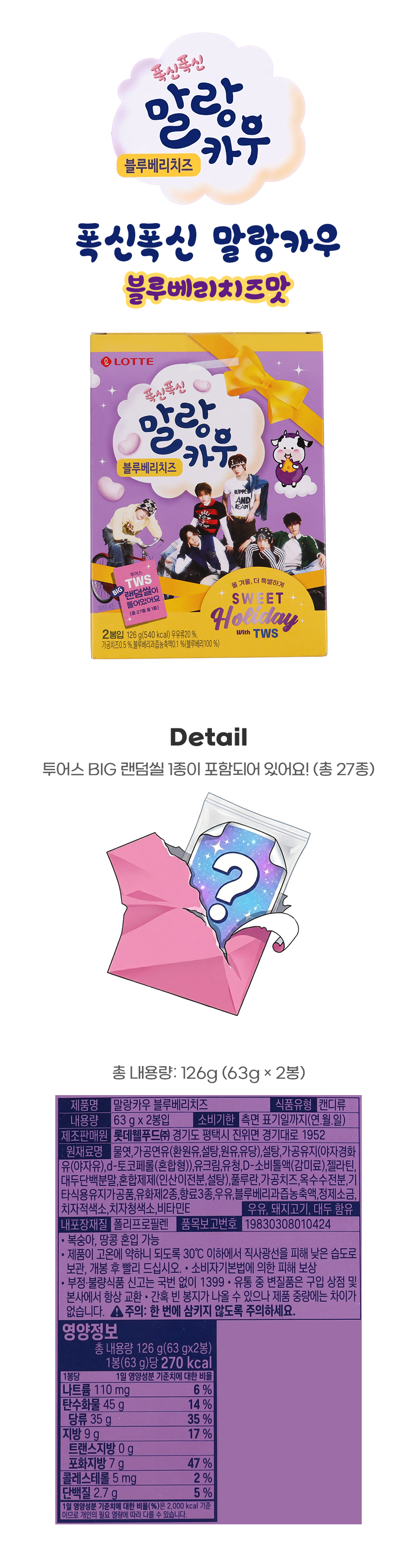 | 품명 및 모델명 | [시즌한정] 말랑카우 블루베리치즈 63g 2개입 25년 하이브콜라보 | ||
