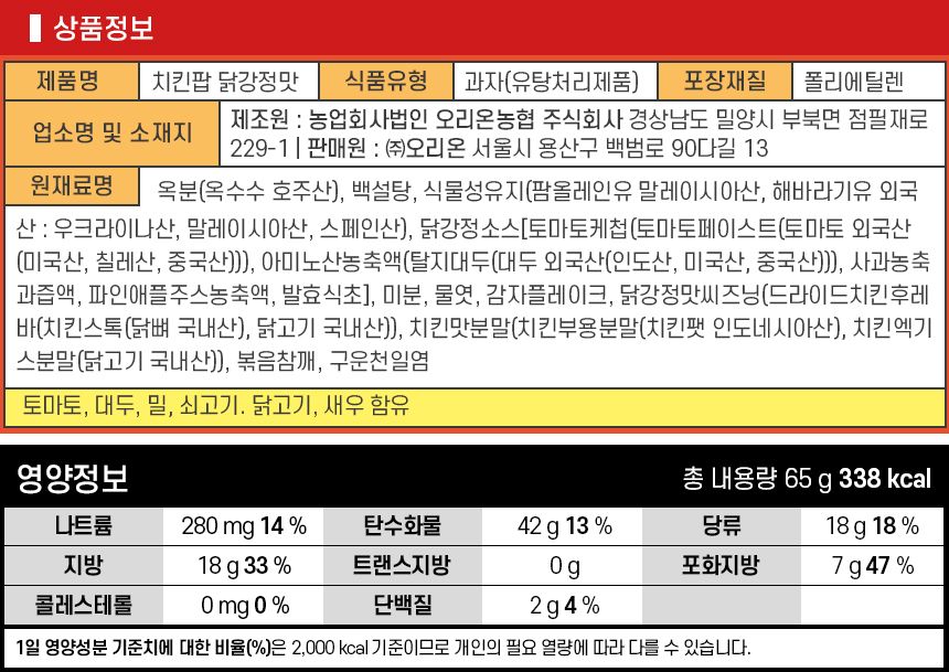 | 포장단위별 용량 | 65g(338kcal) | ||