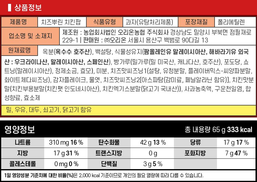 | 생산지정보 | (주)오리온 / 경북 밀양시 부북면 점필재로 229-1 | ||