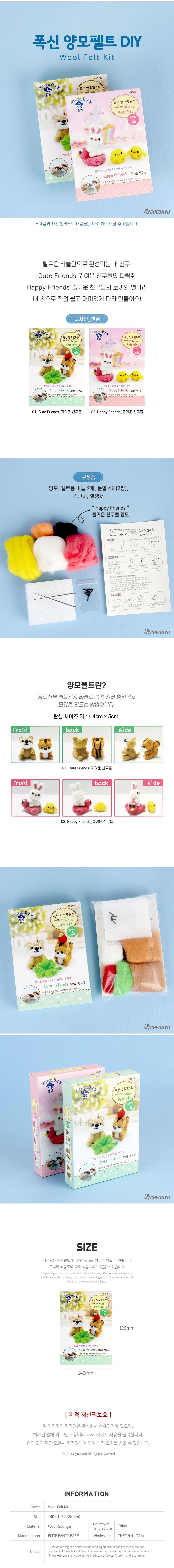 | 제품구성품 | 양모 + 펠트용 바늘 2개 + 스펀지 + 눈알 4개 + 설명서 | ||