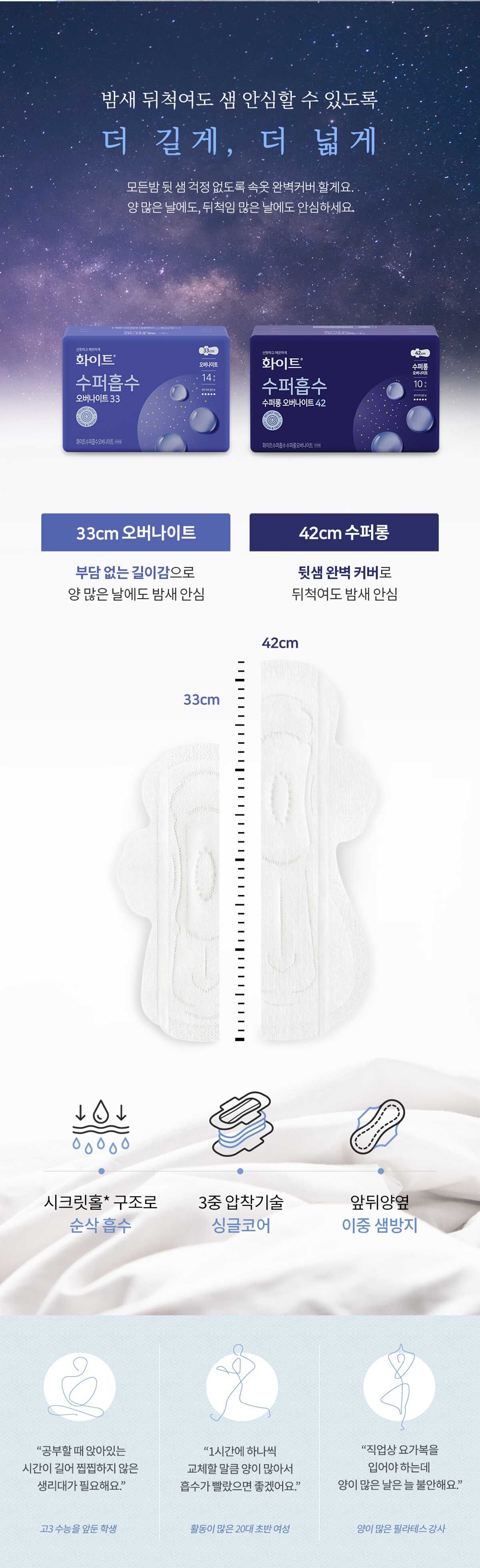 | 품명 및 모델명 | 화이트 42cm 수퍼흡수 수퍼롱 오버나이트 (14+2) 16개입 | ||