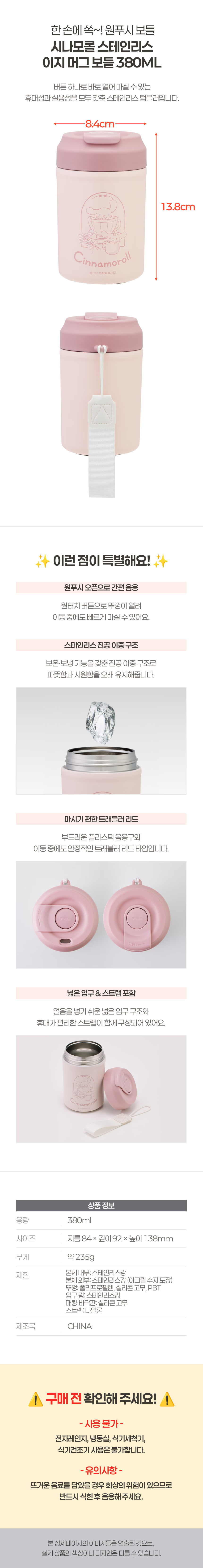 | 품명 및 모델명 | 시나모롤 스텐 이지 머그 보틀 380ml | ||